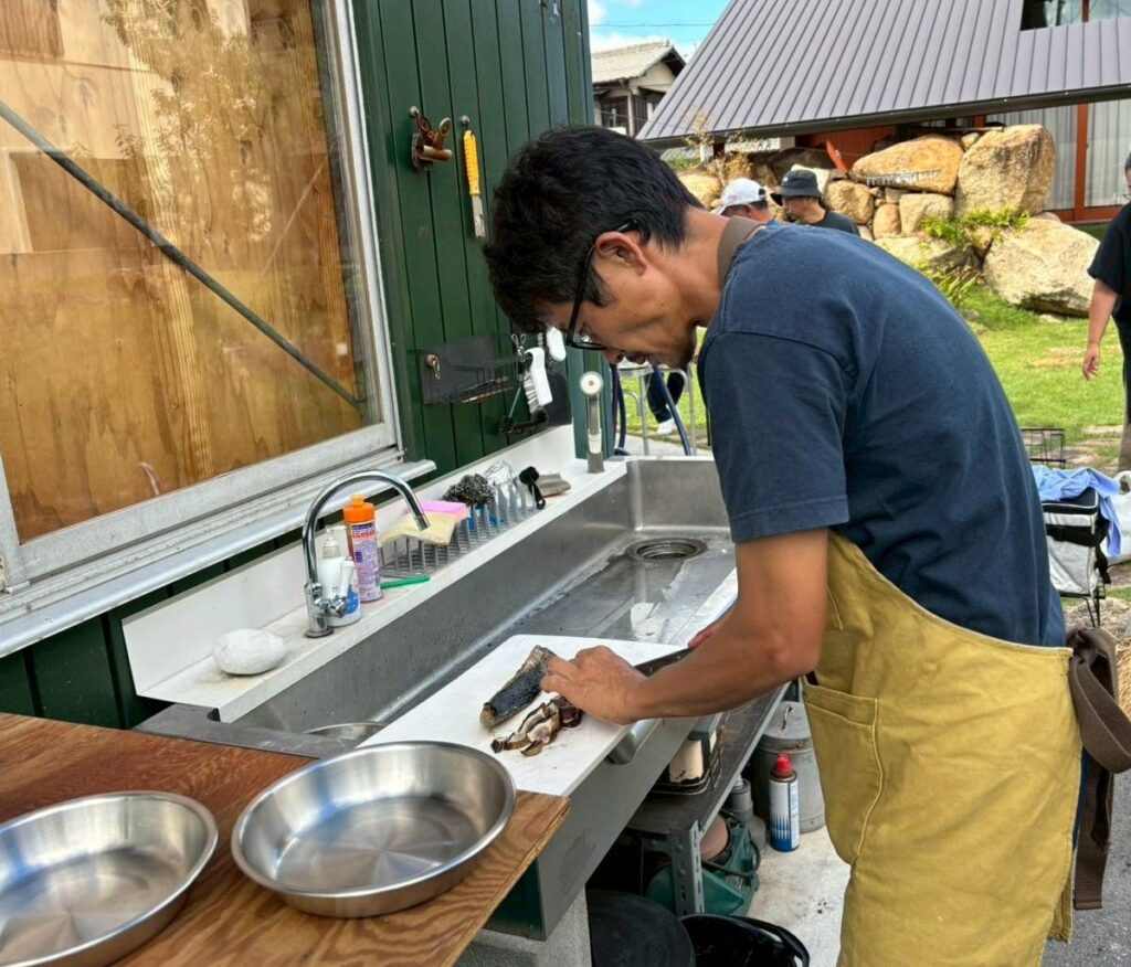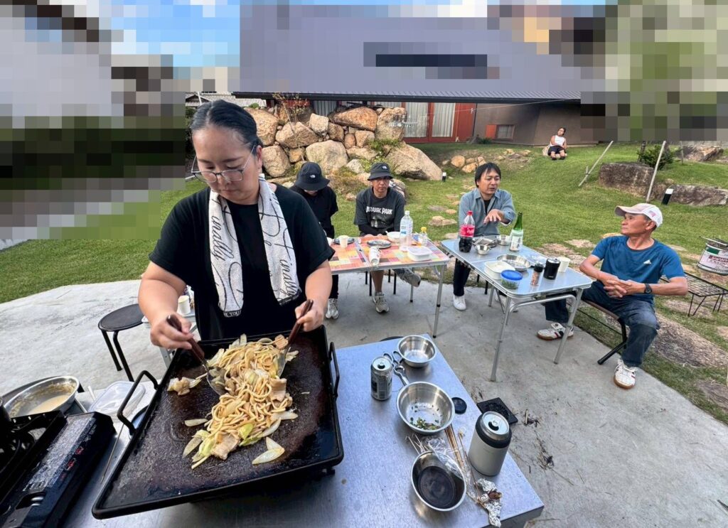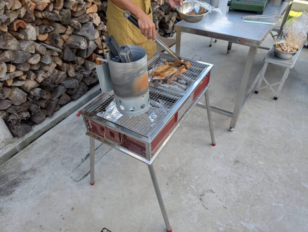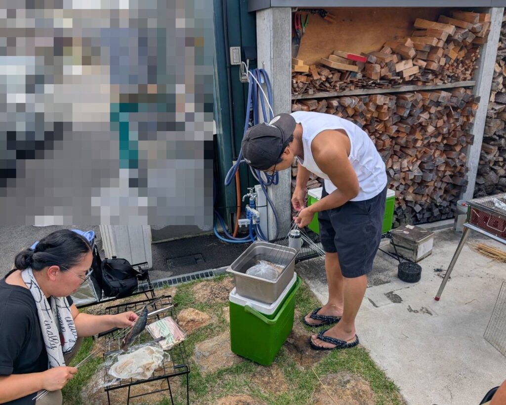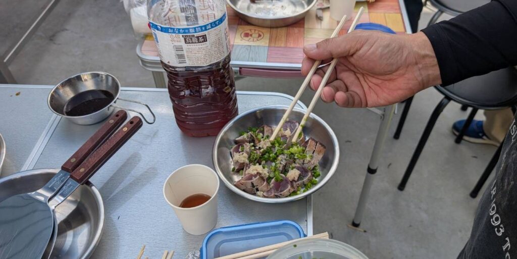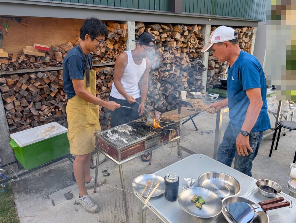 こちらは、この日のメイン料理その1、カツオの藁焼きを作っています♪ 今回初参加の三宅さんの旦那さんが主体で作ってくれました。私はほとんどアウトドア経験がないので、藁焼きは作るのを見るのも初めてでした!!