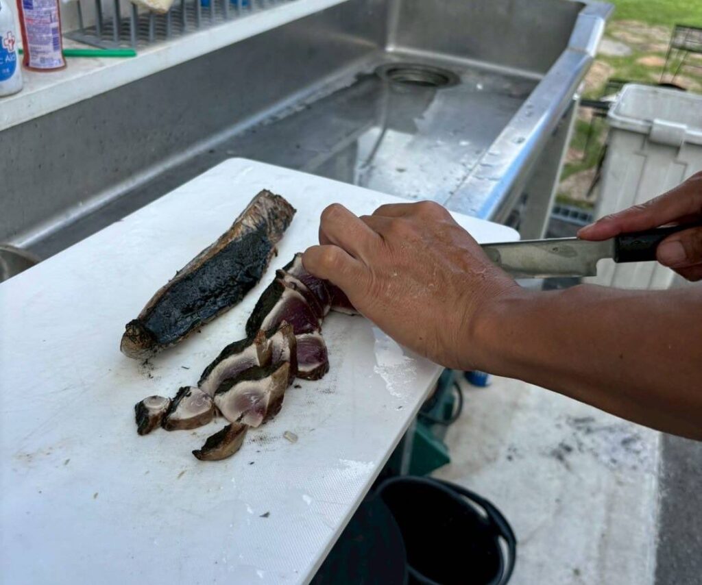 炙ったカツオを社長が切っています。この日のために包丁を研いでおいたそうで、スーッとキレイに切れていました♪