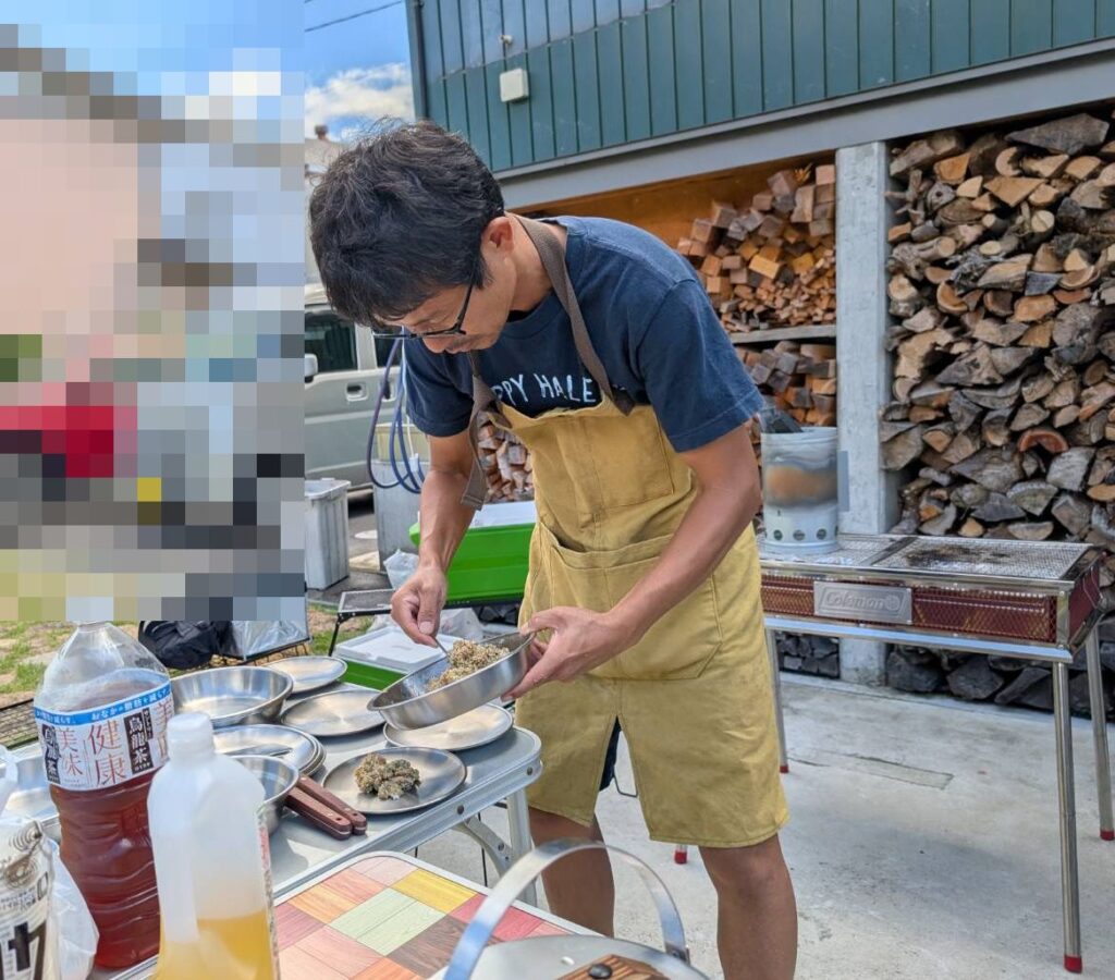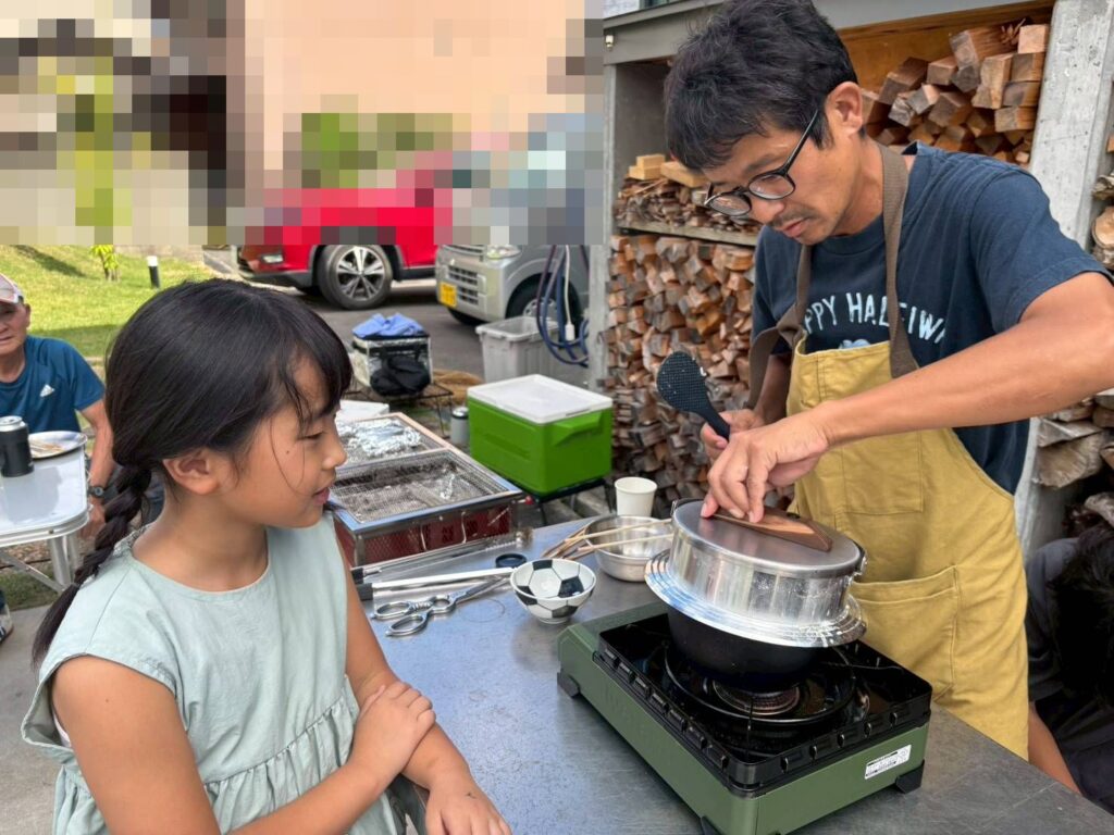 お酒を飲まないメンバーも多いので、白いご飯も大人気♪こちらは炊いたご飯をオープンする所です。 三宅さんの娘ちゃんがワクワクしながら待っています♪