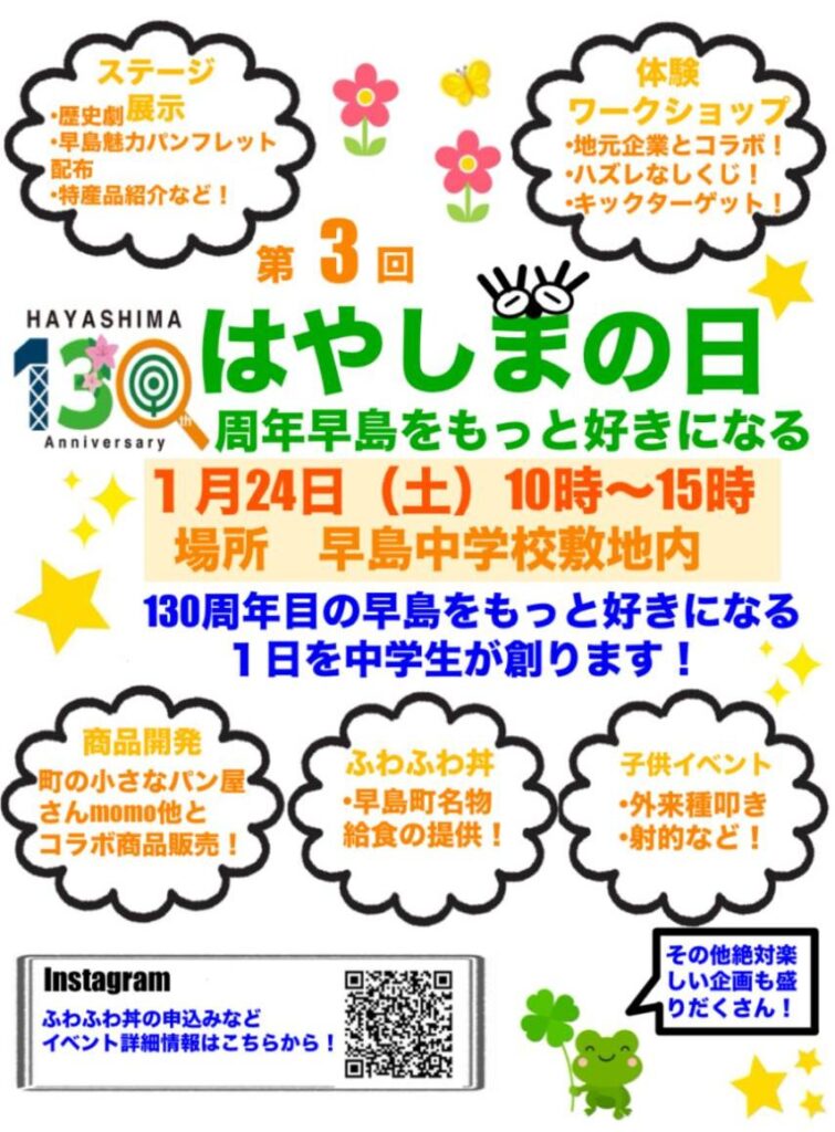 今回の告知チラシです。1月24日(土)10時~15時まで、早島中学校にて開催されます。「早島をもっと好きになる」というテーマをもとに早島中学生が工夫を凝らしたイベントがたくさん行われ、美味しいグルメも色々あるとの事。ぜひ足を運んでみてくださいね(^^)