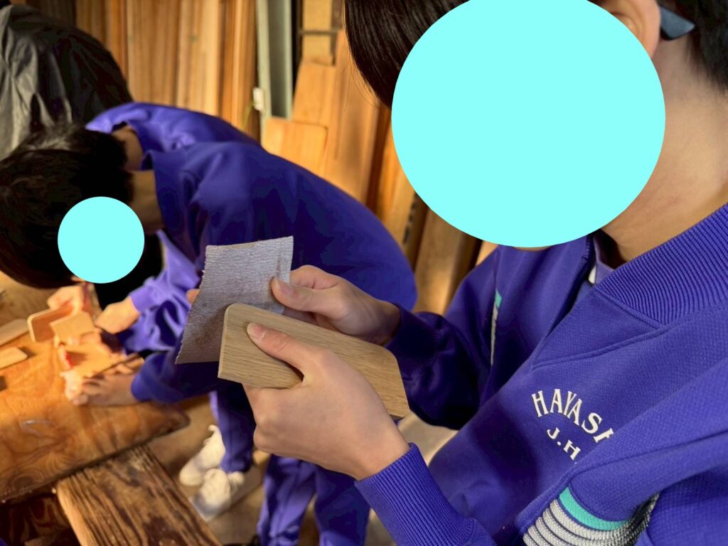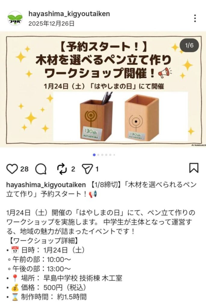 ペン立てについては、中学生が発信する「早島の日」のインスタグラムに載っていました♪ ペン立てに使う木材を数種類用意しましたので、微妙に風合いの違う木材の中からお気に入りの物を作っていただけます。