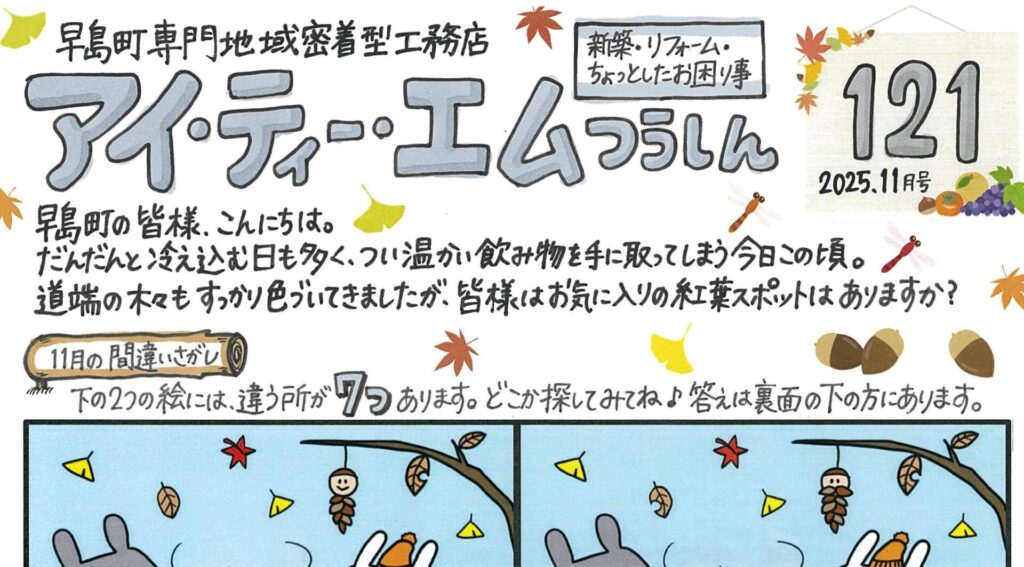 毎月早島町で配布している弊社のニュースレター「アイ・ティー・エムつうしん」に関する事を書いています。お家のお困り事は、アイ・ティー・エムにお気軽にご相談くださいね。
