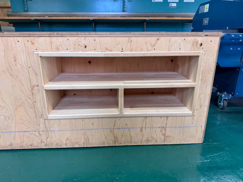 こちらは、会社の作業場にある作業台です。 社長が、この作業台に収納棚を取り付けました。 道具箱をスッキリと納めることができました♪ これできっと作業効率もUPです(^^) -