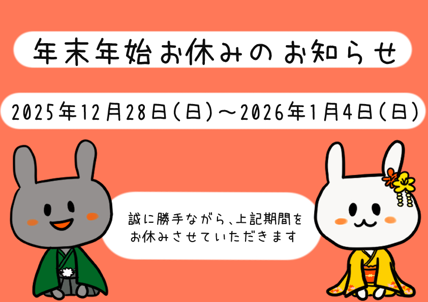 今日から12月。早いもので今年も残り1ヶ月となりましたね。 ちょっと気が早いですが、年末年始のお休みについてお知らせします。2025年12月28日(日)~2026年1月4日(日)までの期間はお休みさせていただきます。 もしかすると、年内に工事をしたいとい...