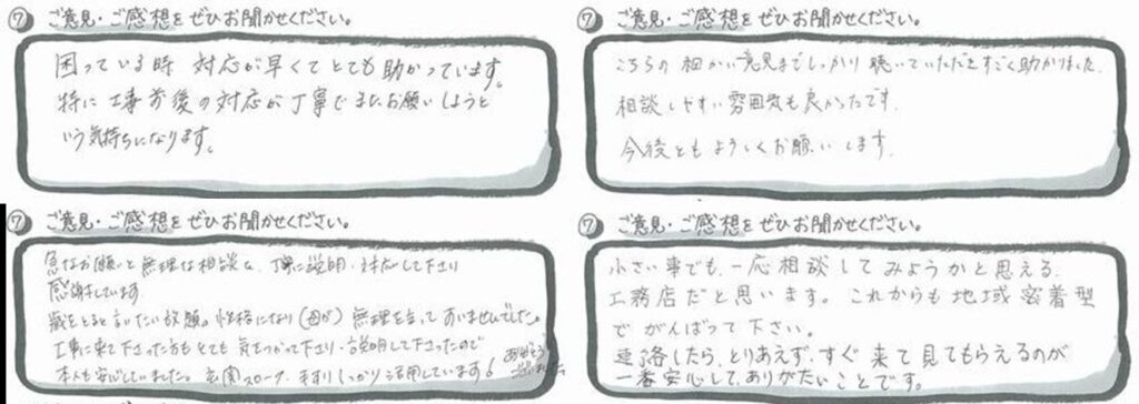 工事をお任せいただいたお客様から届いた感想『お客様の声』を紹介します。 まずは早島町早島のI様です。エアコン工事や補修工事をお任せいただきました。 「丁寧な対応をしていただき大変満足しています。工事中に他の場所(押し入れの床や外の水詰まり... -