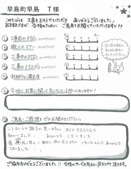エコキュートの調子が悪い時にすぐにきてもらえて助かりました。ありがとうございました。 畳・襖の張り替えも期日に間に合うようにいそいでもらってありがとうございました。