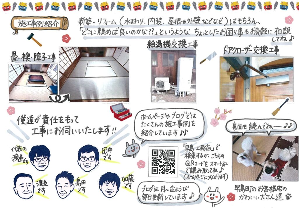 おもて面には、施工事例紹介です。いずれもブログで詳しく紹介した事例です。右下には、早島町のお客様宅の可愛い犬さんが、裏面へご案内♪ 以前にこんな感じで犬さんを載せさせていただいたお客様が、数年後の別のリフォームで訪問した際に、そのアイ・ティー・エムつうしんを飾ってくれていました♪ これからも、地域の皆様と一緒に作っていきたいです(^^)
