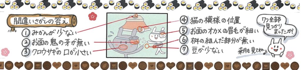 2月なので節分のイラストです。季節のイラストは2024年4月号から始めた「間違いさがし」です。