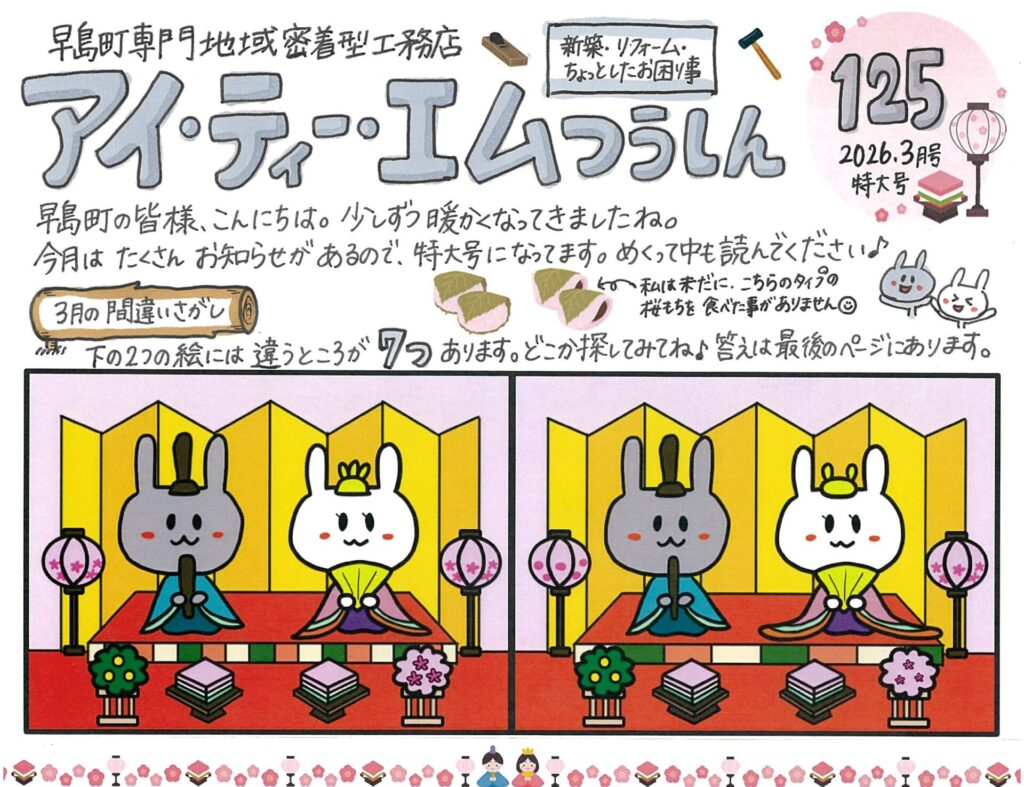 早島町で毎月配布している弊社のニュースレター「アイ・ティー・エムつうしん」第125号です。今月は特大号にしました♪