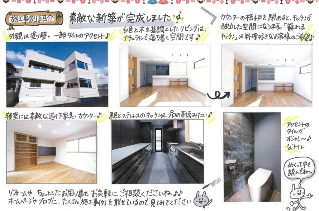 おもて面には、施工事例紹介です。先日ブログでも完成写真をご紹介した素敵な新築についてです♪