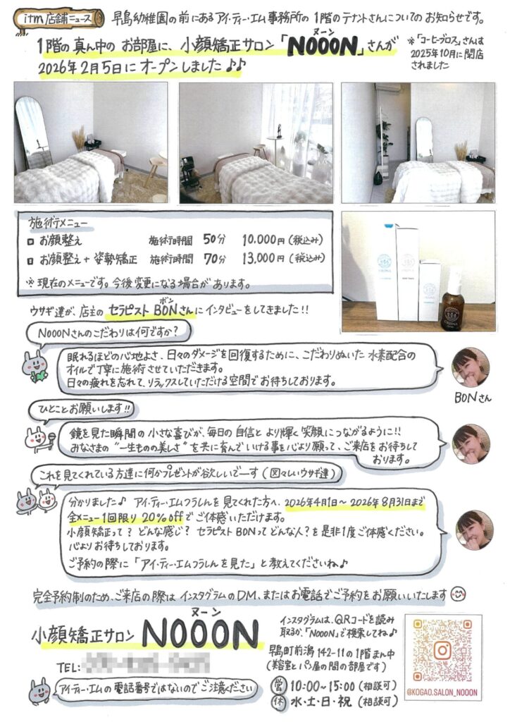 めくった中の左側ページには、アイ・ティー・エム事務所の1階真ん中の部屋に2月5日にオープンした、小顔矯正サロン「NOOON」さんのご紹介♪ な・な・なんと!店主のBONさんが、アイ・ティー・エムつうしんを見た方に向けての特別キャンペーンもしてくれました。ありがとうございます(*^^*)