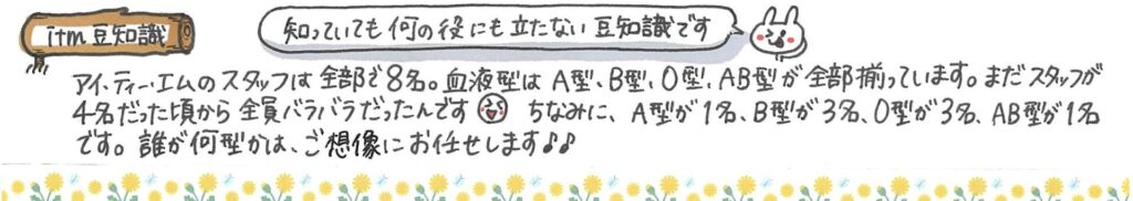 続いては、知っていても役に立ちませんがitmの豆知識をご紹介♪アイ・ティー・エムのスタッフは、A型、B型、O型、AB型、全部そろっているんです。しかもスタッフが4人の時から! ・・・本当に何も役に立たない豆知識ですよね(笑)