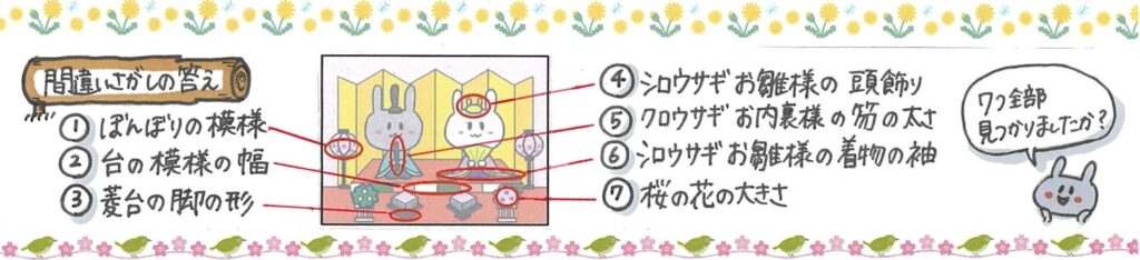 3月なのでひなまつりのイラストです。季節のイラストは2024年4月号から始めた「間違いさがし」です。