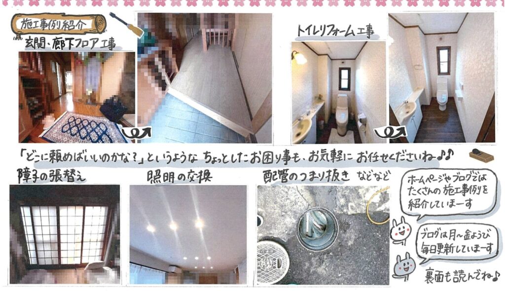 おもて面には、施工事例紹介です。いずれもブログで詳しく紹介した事例です。
