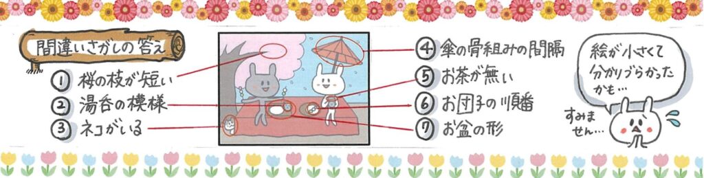 4月なのでお花見のイラストです。季節のイラストは2024年4月号から始めた「間違いさがし」です。間違いさがしは「やってるよ」という声もよくいただくので、3年目に突入しました。