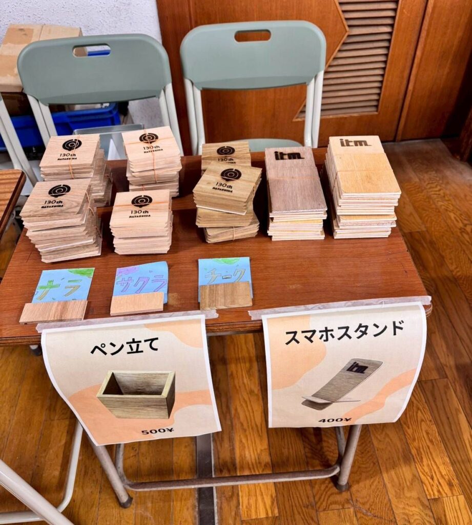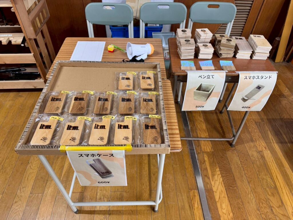 スマホケースは、事前に生徒さん達が作って販売しました。絵が得意な生徒さんが書いたワンポイントのイラストを、技術の先生が私物の機械を使って焼き付けてくれ、とても可愛いです♪