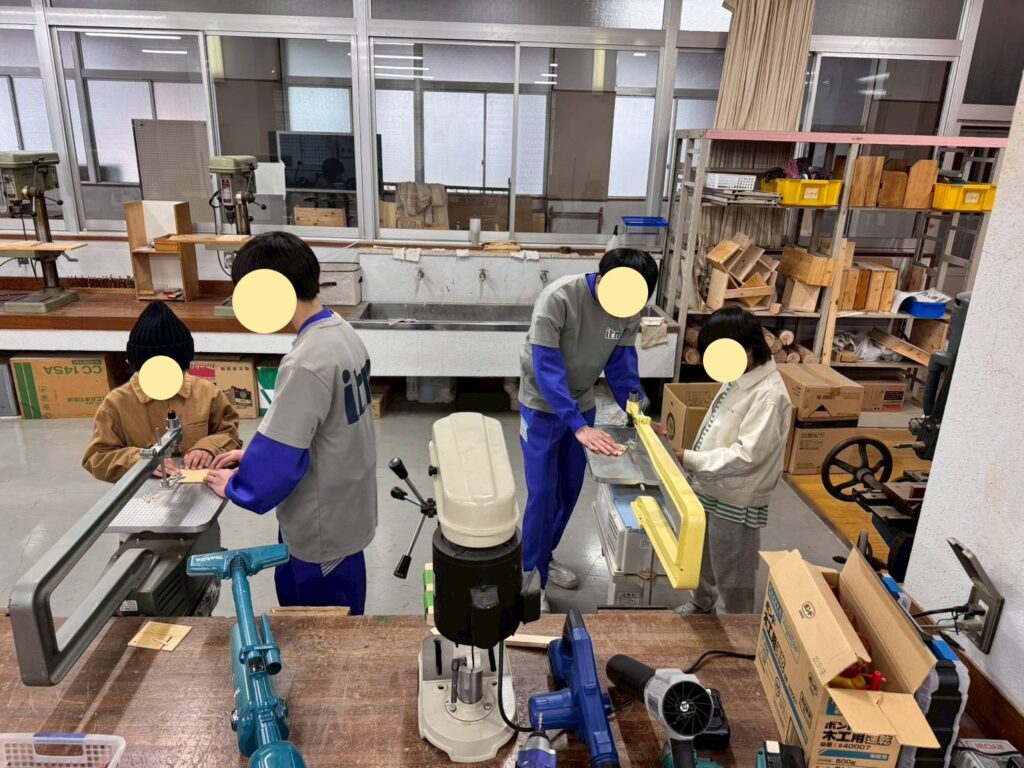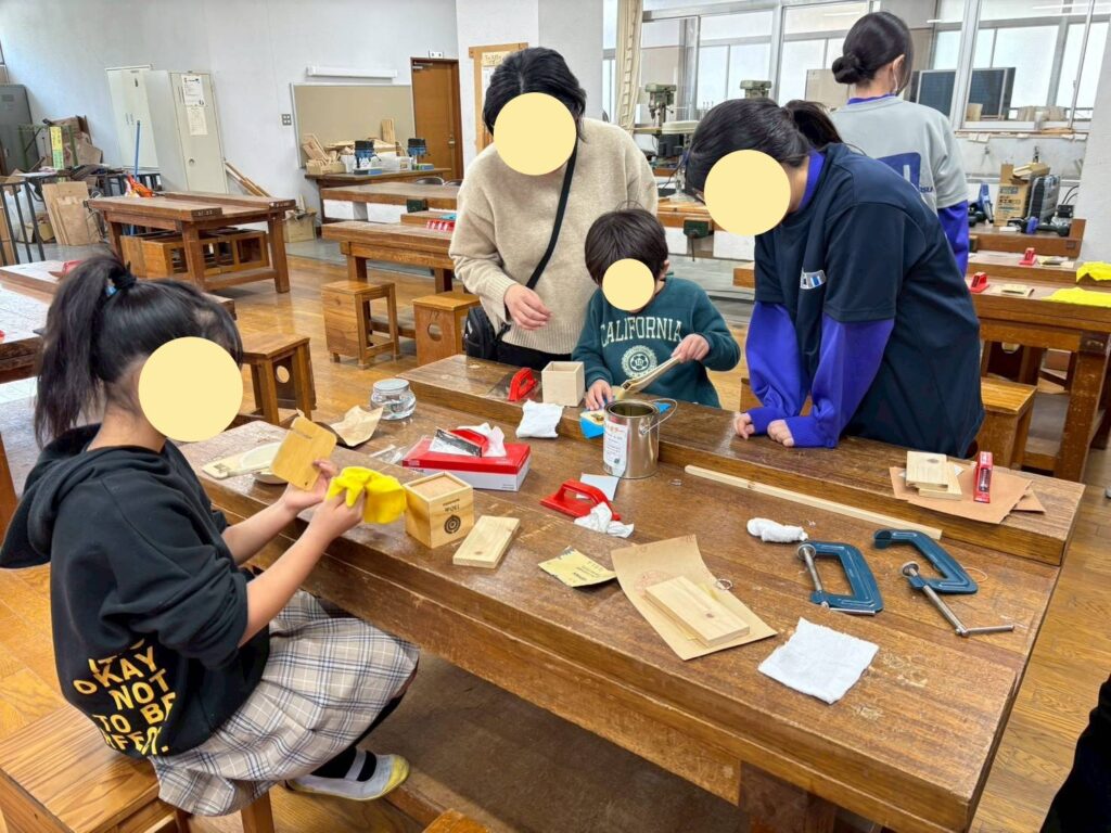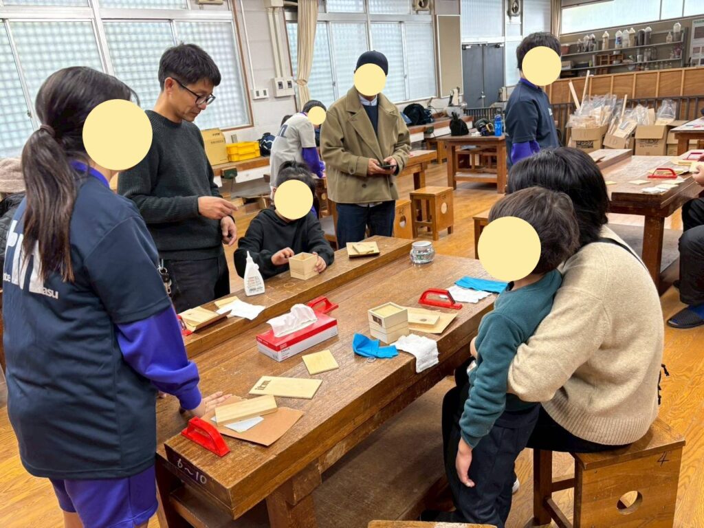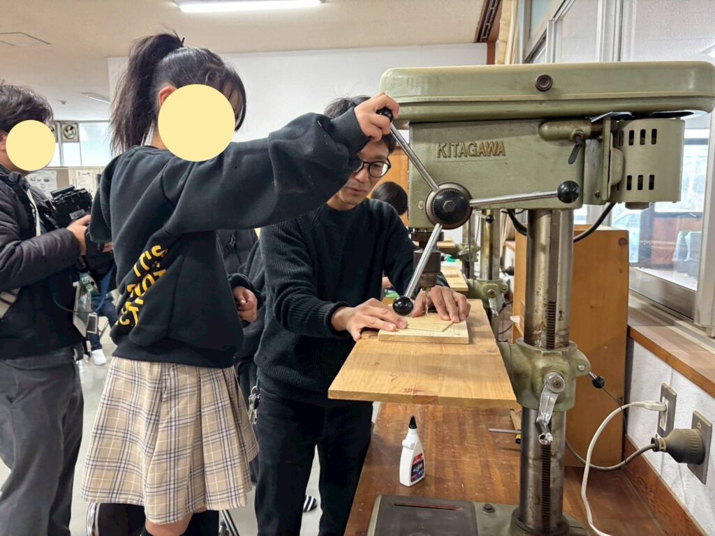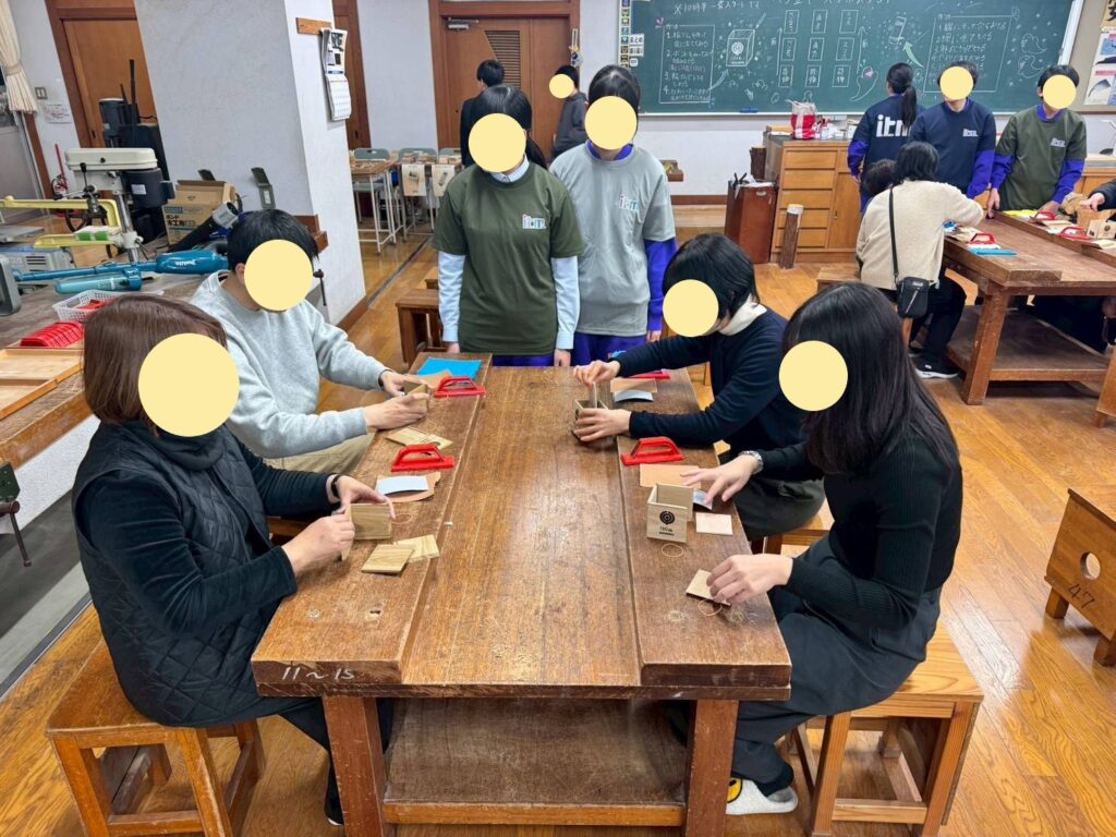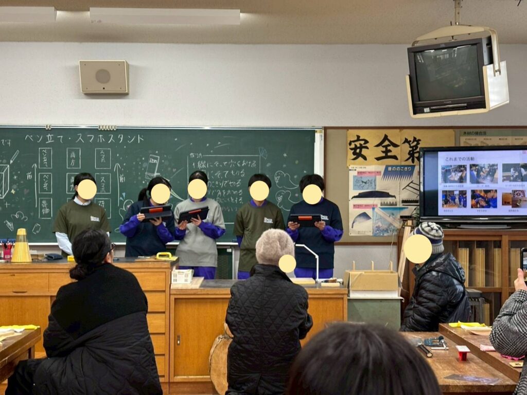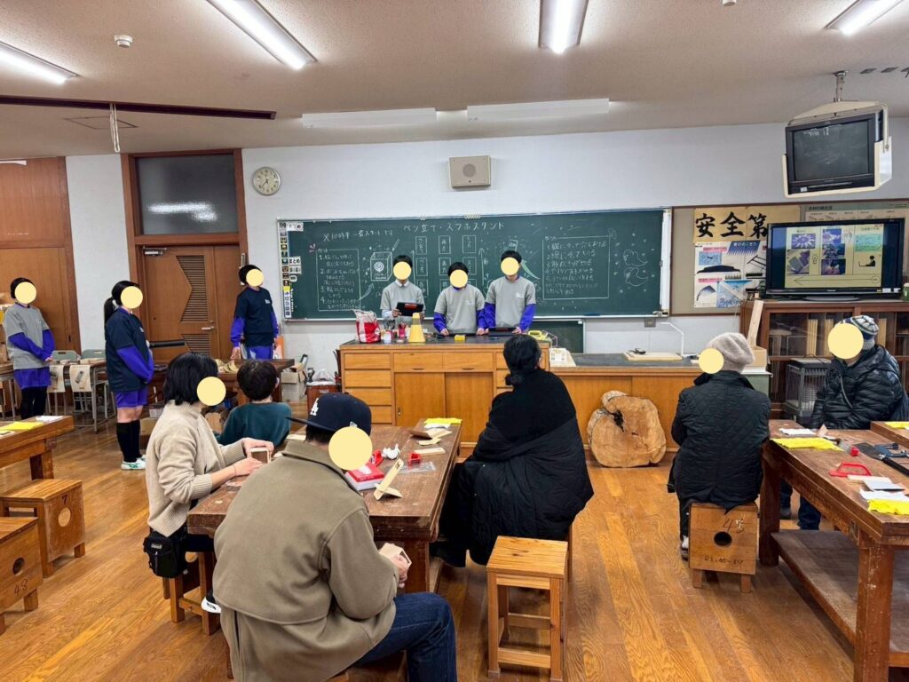 工務店である弊社には「ペン立て作りワークショップ」「スマホスタンド作りワークショップ」「スマホケース作り」への協力要請があり、お手伝いいたしました。担当の生徒さん達と事前に打合せや試作を何度か行い、当日もたくさんの方が参加してくれて大成功でした(^^)