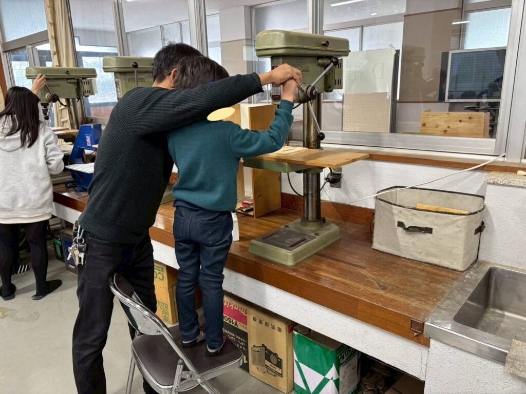 こちらは、スマホホルダーを作っている所です。機械を使って穴をあけています。