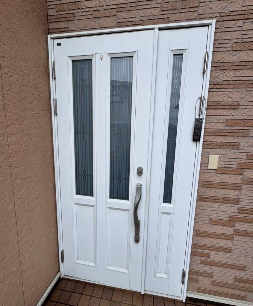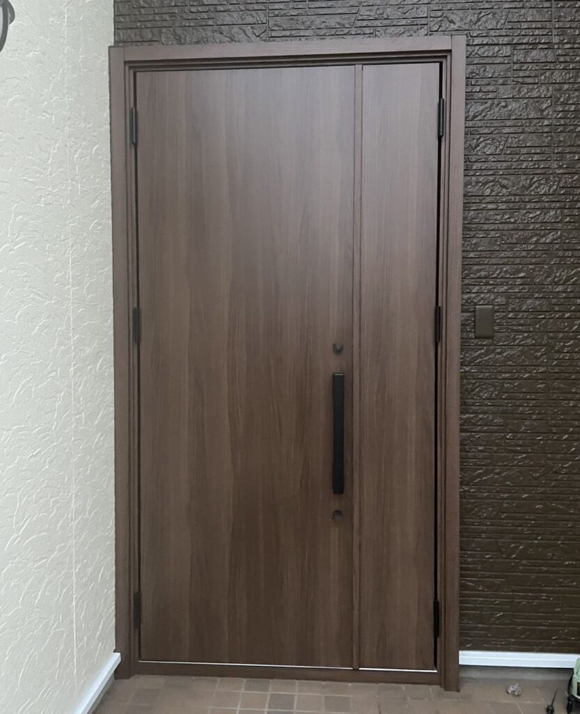 完成写真がコチラです。LIXIL「リシェント玄関ドア3」です。既存のドア枠の上に新しいドア枠を設置するため、工事は1日で完了します。断熱効果もバッチリです♪