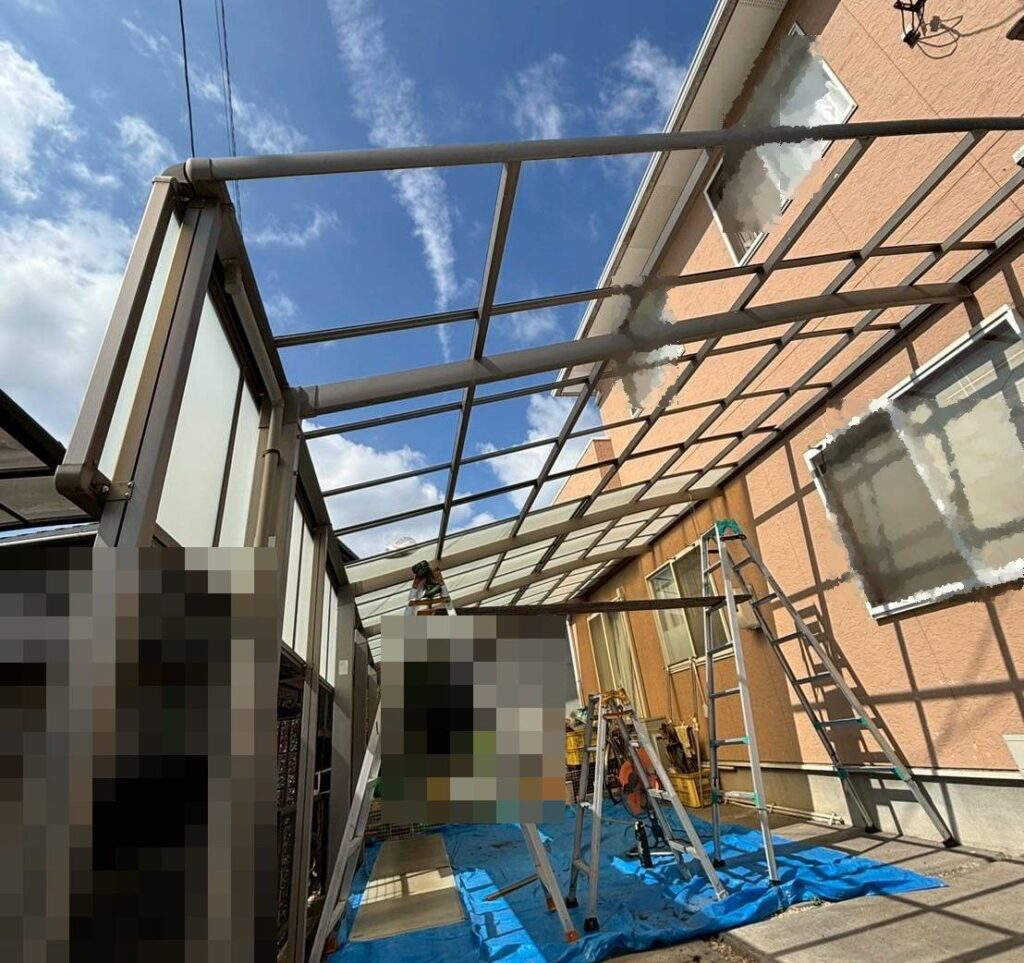足場を組むにあたり、カーポートパネルを外しているところです。